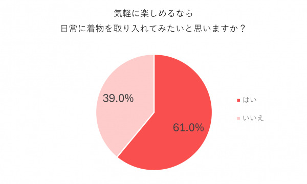 気軽に楽しめるなら日常に着物を取り入れたいかたずねたところ、「はい」と回答した人は全体の61%という結果に。前回調査(50.5%)から10.5ポイント増加していることが明らかになりました。