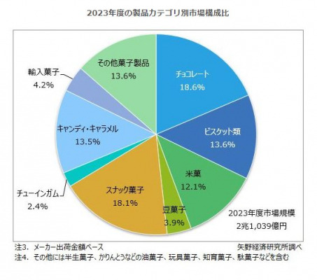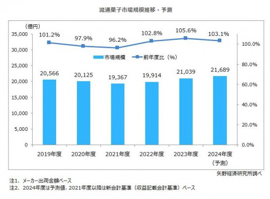 2024年度の流通菓子市場規模は、前年度比3.1%増の2兆1,689億円を予測する。カカオ豆の高騰や円安の進行などのマイナス要素はみられるものの、国内消費者からは堅調に、インバウンドからは引き続き好調にや需要を獲得しており、ビスケット類やスナック菓子、キャンディ・キャラメルなどを中心として、市場は堅調に推移する見込みである。