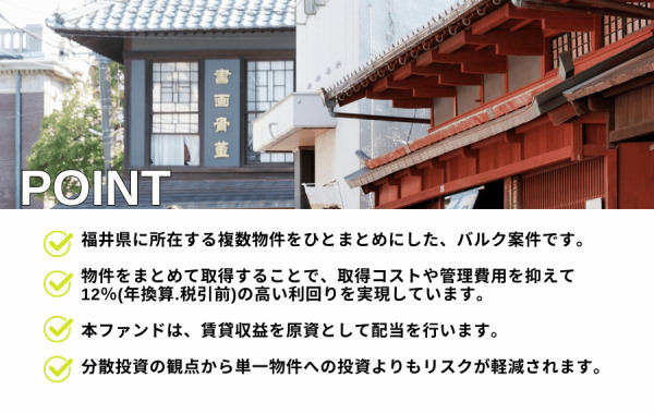 本ファンドは福井県に所在する2つの不動産をひとまとめにしたバルク案件となっており、単一の物件に関連するリスクも分散されます。またファンドは当社が運用を行うため、投資家自身が詳しい知識や経験を持っていなくても、専門的な管理のもとで不動産運用を行うことができます。