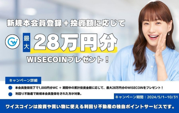 「利回り不動産」では投資する度に「ワイズコイン」が貯まります。貯まったコインは、「利回り不動産」で出資する際に現金と同様に使用することが可能です。