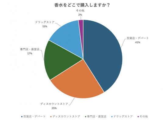香水の購入場所についてのアンケートを行ったところ、「百貨店・デパート」での購入が41%で最多という結果になりました。 理由としては、「様々なブランドが入店している」「一度に多くのブランドを試せる」「店員さんに相談ができる」など、品揃えの良さや接客の質についての意見が多く見受けられました。