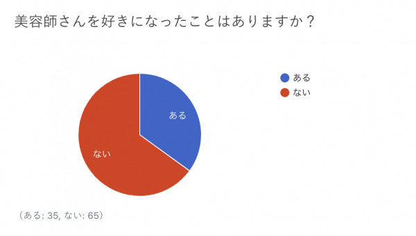 「美容師さんを好きになったことはありますか?」の回答は、“ある”が35%、“ない”が65%となり、3人に1人の割合で美容師さんを好きになったことがあるという結果でした。