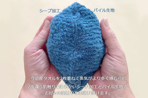弊社定番のタオルフェイスマスク、「蒸美人(じょうびじん)」は発売以来、お客様のニーズにお答えし、ロングセラーを続けております。素材生地は今治のタオルメーカーに依頼した特注のタオル生地を使用。ふわふわと柔らかなシープ加工を施した生地を2枚合わせる事により、蒸気をより多く閉じ込め、たっぷりと素肌で感じる事ができます。また、鼻で呼吸しやすくする穴を開けています。