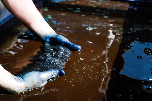 slouch&chicでは、江戸時代に蒅(すくも)づくりの一大産地として繁栄を極めた徳島県吉野川にて工房をもつwatanabe'sに藍染を依頼しています。watanabe'sでは、苗づくりから始め、収穫、蒅づくり、染めまで一貫にて行っております。また、地域の農家、養豚場、学校、給食センターと協力し、フードロスや循環型の取り組みを行っています。形が悪く製品として出荷が出来ない農作物や、給食センターで出た残滓を豚の食料として活用し、養豚場で出た糞尿を発酵させて堆肥化し、完熟堆肥を作っています。養豚場の糞尿廃棄問題の解決、農家の化学肥料コスト削減を実現し、地域に根付き、地球環境に合わせた藍作に取りくまれています。