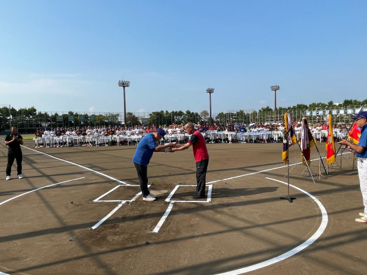 開会式では多数の連盟関係者とともにトミザワグループ専務の富沢進、バッティングドーム店長の佐野が参列し、軟式野球ボール(試合球3ダース)とロジンバッグ2ダースが贈呈されました。