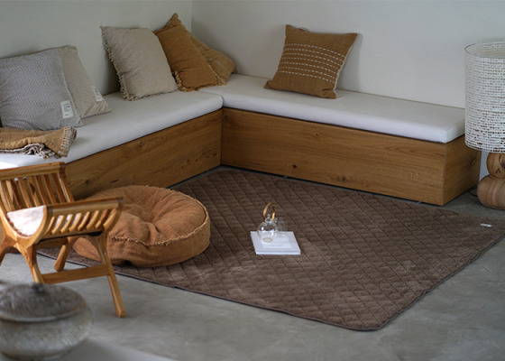 ラグマットのサイズは、定番の四角形4種類に加え、円形もご用意。お部屋の広さやレイアウトに合わせてお選びいただけます。また、ラグマットとコーディネートできるシートクッションも同時発売。高反発ウレタンと通常のウレタンの2層式の中材を使用し、座り心地の良さを追求しました。