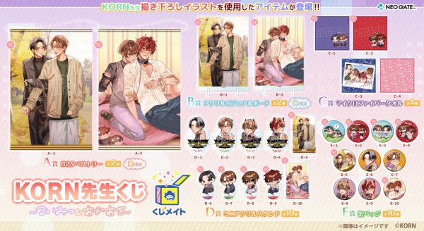 景品デザインには、今回の「くじメイト」のためにKORN先生に描き下ろしていただいた”るいみつ”と”あかあき”の新規イラストも多数登場!