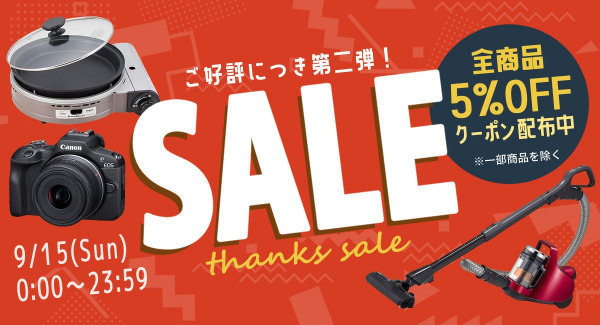 セール対象商品をご購入いただくと、購入金額より5%OFFされるクーポンを発行いたします。