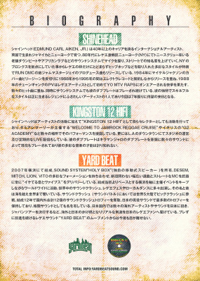 数々のヒット曲に重ね、同時にサウンドシステムでも彼のダブプレートはプレーされ続けている。彼の独特でスキルフルなスタイルは正に生きるレジェンドにふさわしいアーティストの1人であり今回は7年振りに待望の来日となる。