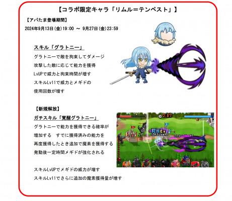 コラボ限定キャラ「リムル=テンペスト」をリーダーにしてリーグに挑む「リーダー腕利きGP」を開催いたします。バトルに勝利してより多くの「キャラフレP」を獲得したランキング上位者や条件を達成した方には、コラボ限定「キャラフレーム」が贈られます。