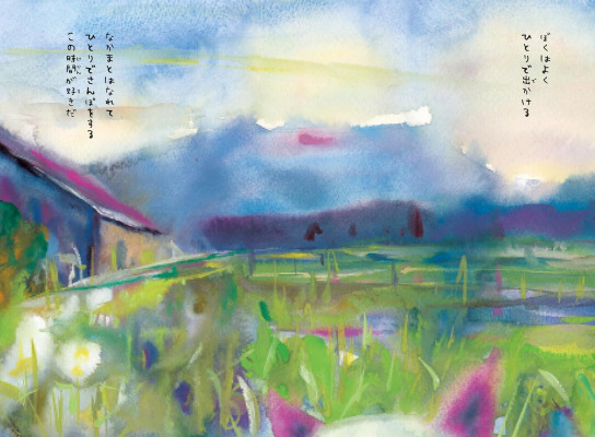 色彩豊かな風景画と子牛たちが美しい、あえて言葉を少なくした水彩画絵本です。