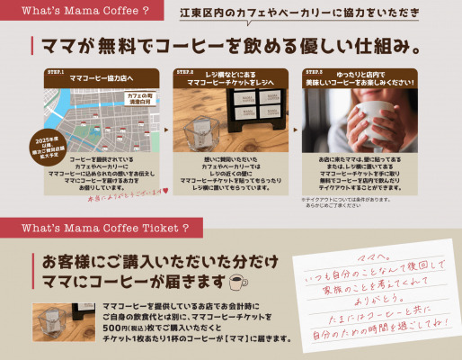 ママコーヒーを提供しているお店でお会計時に、ご自身の飲食代とは別に、ママコーヒーチケットを500円(税込)枚でご購入いただくと、チケット1枚あたり1杯のコーヒーがママに届きます。