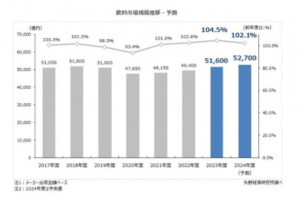 飲料市場は、物価高から消費者の節約志向が強まり、購買意欲は低下傾向にある。2024年度も同様の傾向が続いており、PB商品などよりコストメリットの高いアイテムに注目が集まっている。2024年に入ってもメーカー各社からは値上げの発表が続いていることで、2024年度の飲料市場の動きは前年度と似たような傾向を辿るものと推測できるが、景況感はやや悪化していることから2024年度の飲料市場規模は前年度比102.1%の5兆2,700億円と前年度よりは小幅な上昇になると予測する。