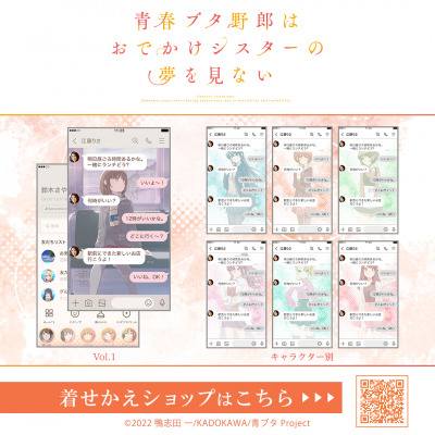「青春ブタ野郎はおでかけシスターの夢を見ない」のLINE着せかえがインクルーズより一斉に配信開始!今回配信されるのは、新作発表ビジュアルを使用したデザインと、「麻衣」、「花楓」、「朋絵」、「理央」、「のどか」、「卯月」の主要キャラクター別のデザインのLINE着せかえが一斉に新登場!是非、LINE着せかえでも「青春ブタ野郎はおでかけシスターの夢を見ない」の世界観をお楽しみください。