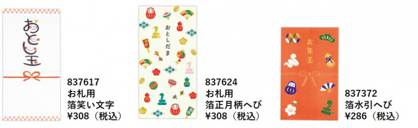 好調のお札用ポチ袋に「笑い文字」デザインが登場。そのほか、お正月小物をちりばめたオシャレな印象のデザインを開発してフレッシュなラインナップに!