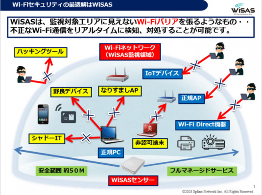 WiSAS(ワイサス)は、フルリモート&フルマネージドを実現したクラウド型Wi-Fiセキュリティ・ソリューションです。監視したいエリアにセンサーを置くだけの簡単導入を実現、Wi-Fi環境の安全性を確保するために開発された製品です。 WiSASには、WiSAS 診断分析ソリューション2種 (スポットサービス)とWiSAS 常時監視ソリューション3種 (年間契約サービス)が用意されています。