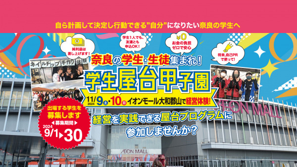 株式会社ズーノ(奈良県橿原市、代表取締役:中田 勉)は、2024年11月9日(土)・10日(日)の2日間、イオンモール大和郡山の1階にて、奈良県の学生(高校生、高専生、専門学生、短大生、大学生、22歳までの社会人もOK)が屋台経営を通じて自ら計画して決定し行動できる人材を育てることを目標にした「学生屋台甲子園2024」を開催いたします。なお、本イベントは、共催:イオンモール大和郡山、協力:複数の会社経営者様の元、非営利活動として開催いたします。