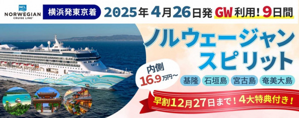 この度販売を開始しましたのは、2025年4月26日発のノルウェージャンスピリット横浜発東京着クルーズです。8泊9日の旅程となっており、基隆(台湾)、石垣島、宮古島、奄美大島に寄港するコースとなります。12月27日まで早割を適用でき、最安値料金は169,800円(2名1室ご利用時のお一人当たりの料金で別途諸税がかかります)です。当コースはお得な4大特典が付いており、2名様合計で最大146,000円相当分の特典を享受することができます。特典の概要は下記のとおりです。