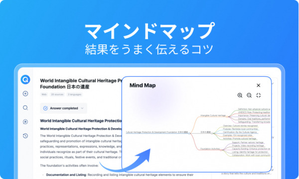 その強力な検索能力に加えて、Feloはマインドマップを通じた情報の可視化においてユニークなアプローチを導入しています。従来の検索結果は、関連データの最初から最後までで、該当するデータを見つけるまで検索を続けるリニアサーチを実施しており、情報に圧倒されることがあります。しかし、Feloのマインドマップは検索結果の視覚的表現を提供し、ユーザーが複雑な概念と関係を一目で把握できるようにします。この機能は理解を助けるだけでなく、創造的な思考と情報のより良い保持を促し、従来のAI検索エンジンに対して明確な利点を提供します。