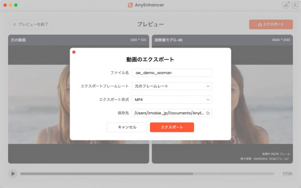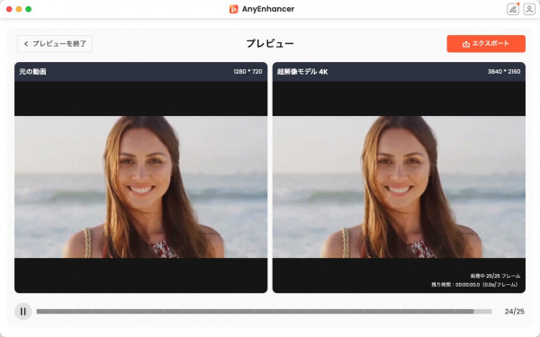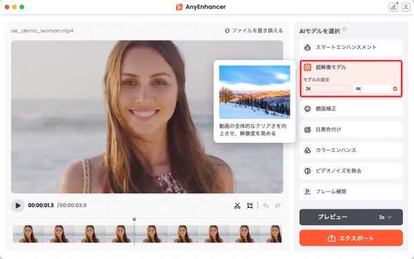3.画質を最高4Kにまで:解像度が低い動画でも、AnyEnhancerの先進的なAIアルゴリズムによって、楽に動画を高画質化します。