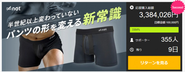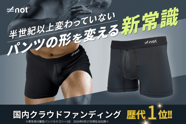 not合同会社(本社:東京都、代表:矢口雅幸)は、購入型クラウドファンディングサイトMakuakeにて8月7日から販売を開始した完全分離型スポーツ用インナーパンツ「FA BOXER BRIEF(日本語訳:エフエー ボクサーブリーフ)」※1が分離型パンツ分野で歴代1位の記録達成しました。