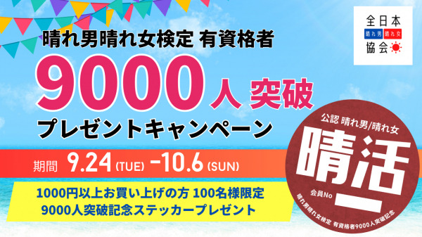 「誰かのために晴れを届ける人であれ」というミッションの元、世界中に「晴れ」を届けている全日本晴れ男・晴れ女協会が2018年から開始しました「晴れ男・晴れ女」を公式に認定する検定試験の「晴れ男・晴れ女検定」の合格者がついに9000名を突破しました。(2024年9月24日 現在9650人)