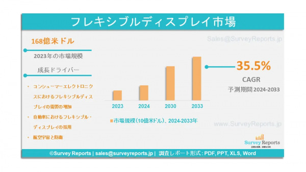 Surveyreportsの専門家は、フレキシブルディスプレイ市場の調査を分析し、2023年に発生したフレキシブルディスプレイ市場規模は168億米ドルであることを明らかにした。また、フレキシブルディスプレイ市場のシェアは、2033年末までに678億米ドルに達する見込みである。フレキシブルディスプレイ市場は、2024年と2033年の予測期間中に35.5%のCAGRで成長すると予測されている。