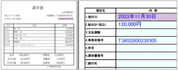 異なるレイアウトの非定型帳票から、必要な項目(例:日付、金額)を自動検出・認識します。