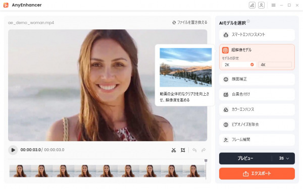 AnyEnhancerは、AI技術を活用して動画の画質を向上させる先進的なソフトウェアです。このツールは、低解像度の動画を最大4Kまでアップスケーリングし、色彩やディテールを鮮明に復元します。さらに、顔のディテールを強化する機能やフレームレートの最適化も行い、滑らかで高品質な映像を提供します。