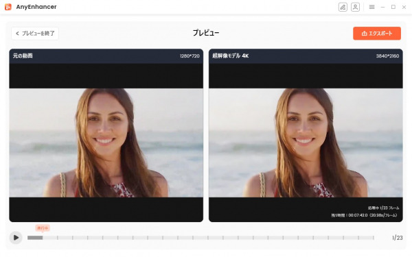 高画質化の効果をすぐに確認でき、元の動画と高画質化後の比較が可能です。視覚的な違いを一目で実感できます。
