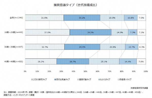 世代別に各タイプの構成をみると、Z世代といわれる18歳~29歳は、30代や40代と比べて、「こだわり探究タイプ」「流行お気楽タイプ」の構成比が高いという結果であった。