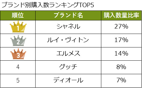 日本国内のドメスティックブランドではなく、世界三大ブランドと呼ばれる人気の「シャネル」「ルイ・ヴィトン」「エルメス」が上位を占める結果となっています。