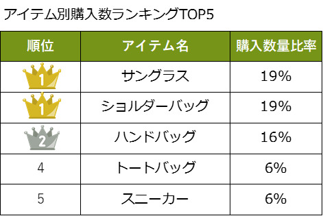 定番の「ショルダーバッグ」「ハンドバッグ」「トートバッグ」といったバッグ類が上位にランクインしていますが、夏ならではのアイテム「サングラス」が「ショルダーバッグ」と並んで同率1位となっています。