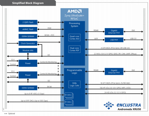 AMDのZynq UltraScale+RFSoCを搭載: 930万システムロジックセル、Cortex-A53 1.3 GHzプロセッサ4基、Cortex-R5F 533 MHzプロセッサ2基、8つのデジタル-アナログおよびアナログ-デジタル無線周波数コンバーターを組み合わせた、優れた性能と柔軟性を提供します。