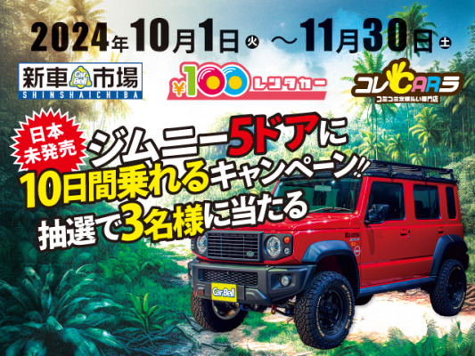 株式会社カーベルは、「新車市場」、「100円レンタカー」、「コレCARラ」の3ブランド合同で「ジムニー5ドア10日間に乗れるキャンペーン」を開催。抽選で3名様にジムニー5ドアを10日間無料レンタル、または150名様に店舗で使える3,000円クーポンをプレゼントします。
