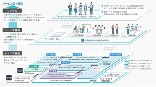 本サービスは、長年の運用実績を持つTISの安心・安全な「インフラ基盤」、サービスの企画から開発、運用まで一気通貫でサポート可能な「サービス基盤」、先進テクノロジーに習熟した「サービスアーキテクチャコンサルティングチーム」の3つで構成されています。これらを最適な形に組み合わせて提供することで、企業がアプリケーション開発へ専念できる環境の実現や、インフラ運用にかかる負荷の軽減を目指します。