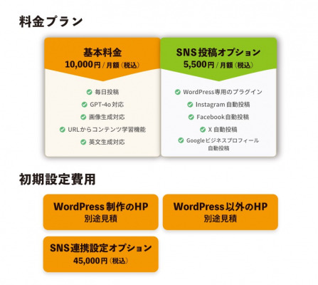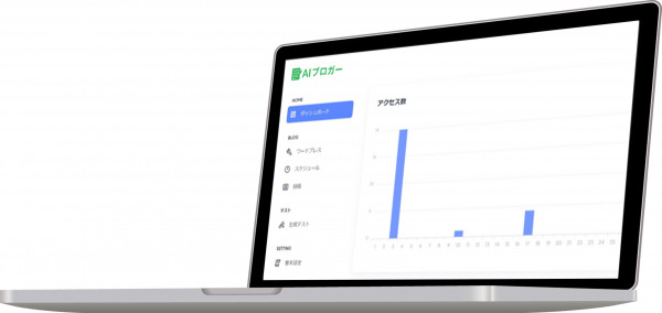 自社のビジネスに関連するキーワードを設定するだけで、AIが自動的にSEO効果の高いブログ記事と関連する画像を生成。記事はWordPressや各種SNSに設定したスケジュールに基づいて自動投稿されます。