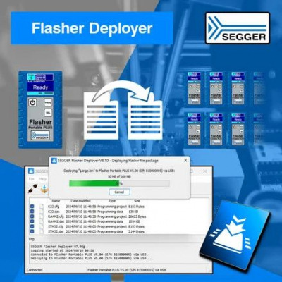 広範なFlasherデバイス対応: Flasher Deployerは、あらゆるSEGGER Flasherデバイスで動作し、特に世界中のサービス技術者に信頼されている「Flasher Portable PLUS」との組み合わせに最適です。この製品はオンチップおよび外部フラッシュメモリを持つマイクロコントローラ向けのポータブルかつ耐久性のあるスタンドアロン型サービスプログラマーとして知られています。