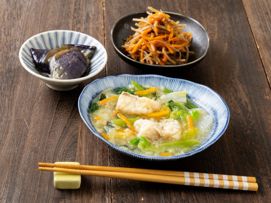 今回は、さくら真鱈を一口サイズにカットし、小麦粉を塗してサッと揚げ、白菜・小松菜・大根・人参と一緒に卵でとじました。フワッとした真鱈の食感と旨味をお楽しみください。