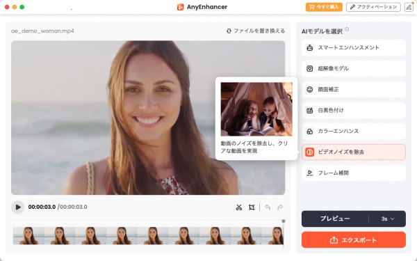 AnyEnhancerは、先進的なAI技術を活用し、動画のぼかしを削除し、画面を鮮明にしてくれるなどの機能を提供します。数回クリックするだけで、すぐぼかした動画を鮮明にさせることができます。