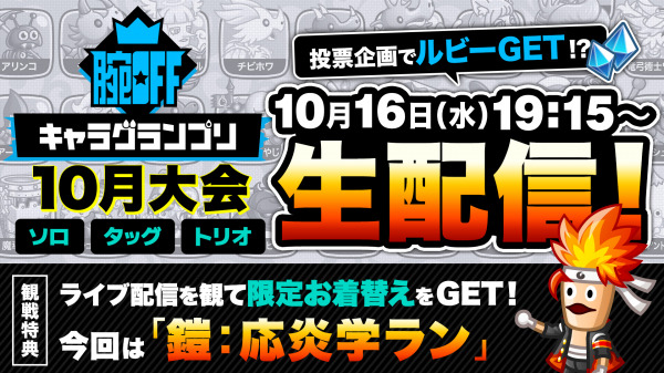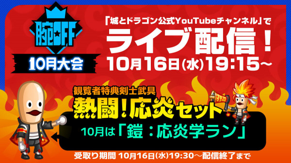 2025年2月15日(土)に東京にて開催される「城ドラフェスティバル2024-2025」。その「腕OFFキャラグランプリ 王者決定戦」の出場へ向けた「腕OFFキャラグランプリ ソロ/タッグ/トリオ10月大会」の模様を、2024年10月16日(水)19:15より『城とドラゴン』公式YouTubeチャンネルにて生配信いたします。配信を視聴された方には、剣士の限定お着替え「鎧:応炎学ラン」をプレゼント!9月、11月の生配信で配布のお着替えと合わせれば、「熱闘!応炎セット」が完成します。また、優勝者(またはチーム)を予想して最大3,000ルビーが獲得できる視聴者参加企画も実施予定。ぜひご観覧ください!