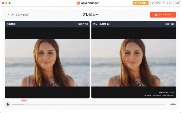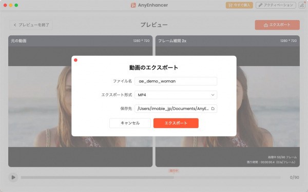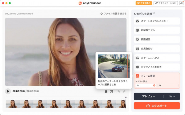 Step2:「フレーム補間」モデルを選択し、動画自身の状況に応じて2倍または4倍のフレー補間モデルに設定します。これでAnyEnhancerが自動的に手ぶれの補正を始めます。