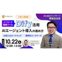 株式会社バイタリフィ、「Dify直近アップデート情報追加版!Dify活用 AIエージェント導入の進め方<基礎編>」を2025年10月22日(水)12:00に開催