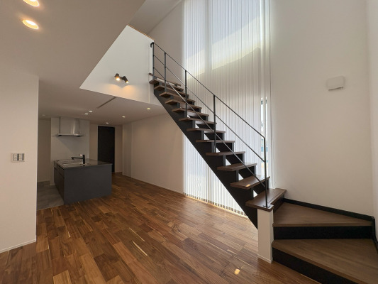 リビングには黒をアクセントにしたオープン階段を配置し、アイアン手すりが空間に軽やかなデザイン性を加えています。