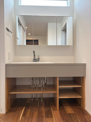 水回りには、弊社オリジナルの造作洗面台を採用。家事動線を重視し、「干す・たたむ・しまう」が1か所で完結する設計にしています。また、人気のガス乾燥機「乾太くん」を搭載し、日々の家事負担をさらに軽減できる仕様としました。