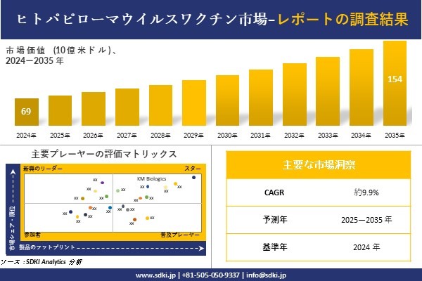 ヒトパピローマウイルスワクチン市場に関する当社の調査レポートによると、ヒトパピローマウイルスワクチン市場規模は 2035 年に約 154億米ドルに達すると予想されています。さらに、2024 年の ヒトパピローマウイルスワクチン市場規模は約 69億米ドルとなっています。ヒトパピローマウイルスワクチンに関する市場調査レポートでは、市場は 2025-2035 年の予測期間中に約 9.9% の CAGR で成長するとも述べられています。
