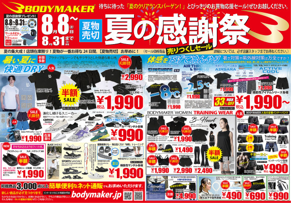 BODYMAKER(ボディメーカー)は、とびっきり!夏のクリアランスセール「売り尽くし 夏の感謝祭」を公式直営サイト及び直営店舗で、8月8日(金)より9月1日(月)までスタートします。新作・旧作アイテム大放出する夏のお買物応援セール!同時に同タイトルの店舗チラシを配布。新作ウエア、シューズ、サンダルなど中心に、トレーニングや格闘アイテムなどお買得アイテムを多数掲載。目玉アイテムを一部紹介すると、夏の定番bmtw DRYメッシュハーフスリーブ1・2各種¥3,990→¥1,990の半額、遮熱効果で体感-8℃ BM・DRY サンシェード ハーフスリーブ¥3,990→¥1,990の¥2,000引き、人気のインナーパンツついにどれでも¥990など。夏に大活躍のサンダルがスペースシップはじめ¥990多数。BODYMAKER(ボディメーカー)は、お客様がお得な買い物ができるように応援し続けます。ぜひ、一度ご覧ください。