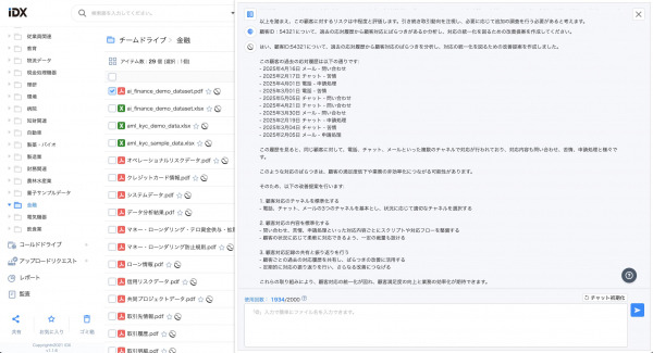 本モジュールは、 勘定系システム、 CRM 顧客管理 、 AML アンチマネーロンダリング システム、 モニタリングレポートなどからエクスポートされたデータファイルをIDXにアップロードし、口座情報・取引履歴・顧客応対・リスク評価をAIで横断的に処理・分析する、 金融現場の“AI参謀”として設計されています。