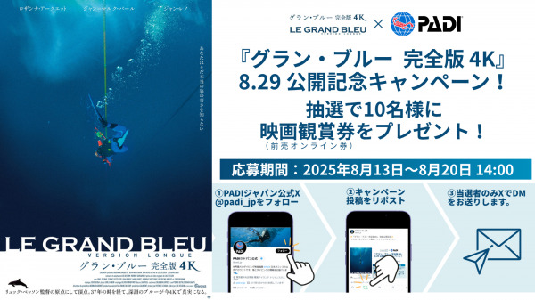 PADIは世界中でフリーダイビングやスキューバダイビングの普及に取り組み、映画をきっかけに「潜ってみたい」という想いを現実にできる環境を提供しています。本キャンペーンを通じて、スクリーンで出会った“あの青”を、現実の海でも感じていただければ幸いです。