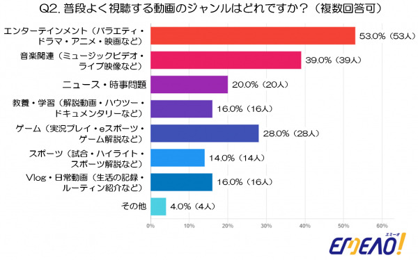 最も多く視聴されているジャンルは「エンターテインメント(バラエティ・ドラマ・アニメ・映画など)」で53.0%(53人)と半数を超え、幅広い娯楽コンテンツへの強い嗜好がうかがえます。